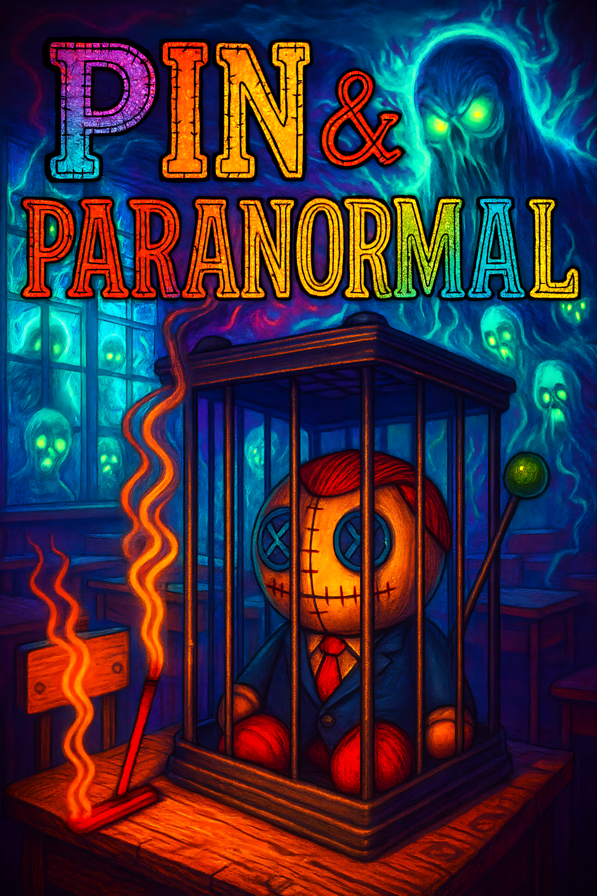 In Pin & Paranormal, 3-5 players take on the roles of curious kids trapped in a school gripped by strange supernatural events. Together, you’ll sneak through haunted hallways, collect schoolyard supplies, and race to save the school, now taken over by a sinister Djinn who’s captured the Principal’s conscience into a voodoo doll!